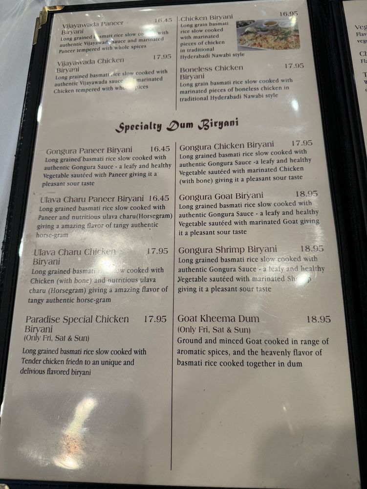 Located on Topanga Canyon Blvd, Paradise Biryani Pointe invites diners into a world of authentic Indian flavors. The menu boasts an impressive array of dishes, with a focus on hearty biryanis and tantalizing appetizers. Vegetarians can delight in options like Vegetable Samosas and Gobi Manchurian, while meat lovers will appreciate the robust flavors of Chicken 65 and Goat Sukka.